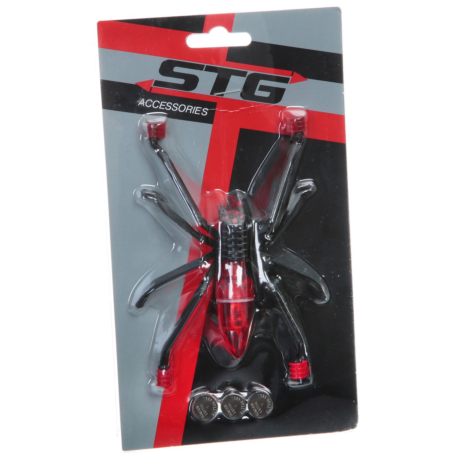 Фонарь STG с креплением на спицы. Светится во время движения. Работает до 30 часов от батареек типа AG10.