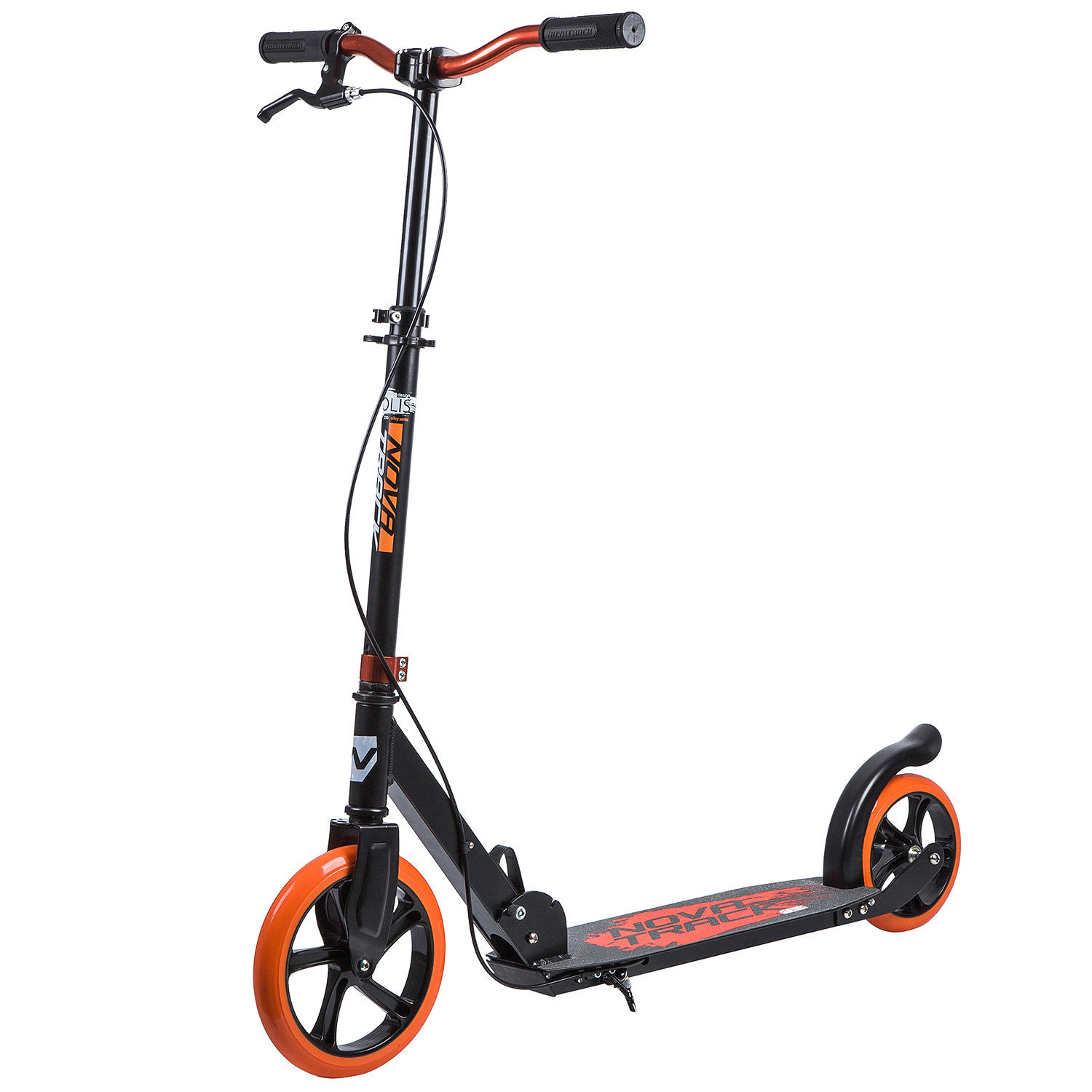 Novatrack Polis 230B 2019 алюминиевый складной самокат имеет механизм, который прекрасно подходит для тех, кто любит высокую скорость, плавность и мягкость езды. Колеса диаметром 230 мм и 180 мм обеспечивают оптимальное соотношение комфорта и скорости. Увеличенный диаметр переднего колеса позволяет без особых проблем кататься не только по асфальтовой дорожке, но и по плитке или брусчатке. Для более надежного торможения модель оборудована передним тормозом.
