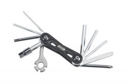 Мультитул для велосипеда включает в себя 12 наиболее необходимых в ежедневном использовании инструментов шестигранников на 2, 2.5, 3, 4, 5, 6 и 8 мм, плоской и крестовой отверток, ключа Torx T-25, гаечного ключа на 8 мм, а также спицных ключей разных размеров. Инструмент выполнен из калёной инструментальной стали.