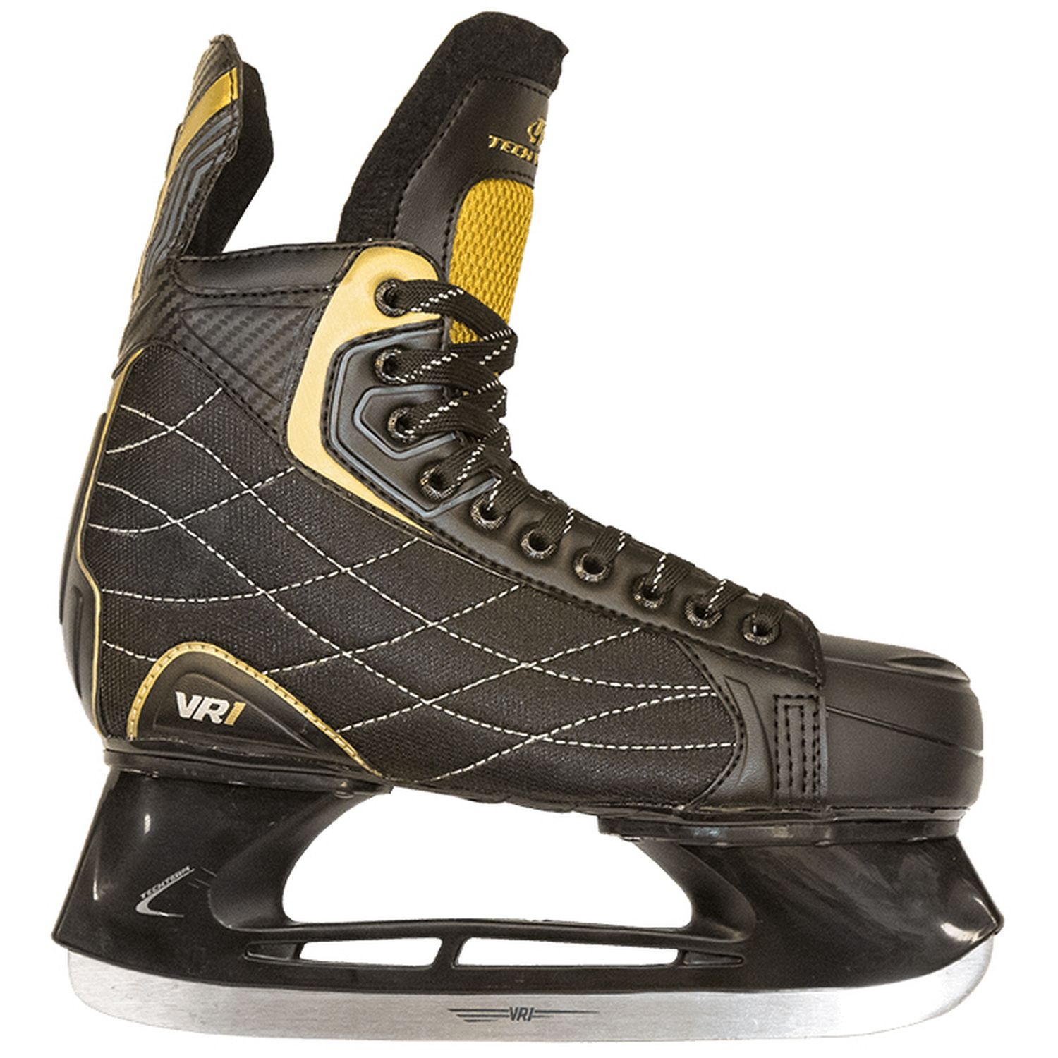 Хоккейные коньки черном цвете с синими элементами. В конструкции ботинка применены морозоустойчивый пластик и ПВХ. Утеплитель выполнен из вельвета.