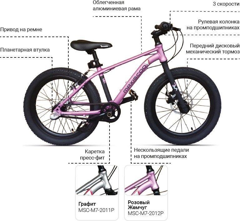 Одной из главных особенностей Maxiscoo 7Bike является ременной привод, который заменяет традиционную цепь. Это решение не только снижает уровень шума, но и значительно упрощает обслуживание. Планетарная втулка Shimano Nexus с тремя скоростями обеспечивает плавный переход между передачами, позволяя детям уверенно справляться с различными дорожными условиями.