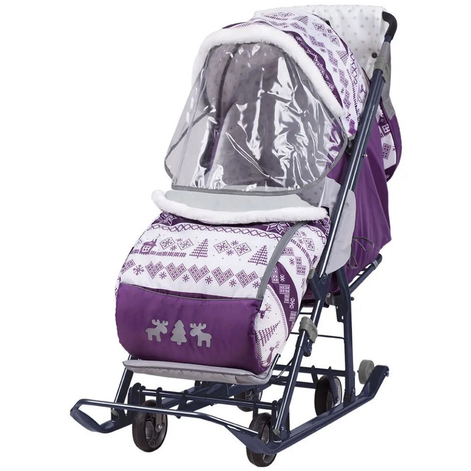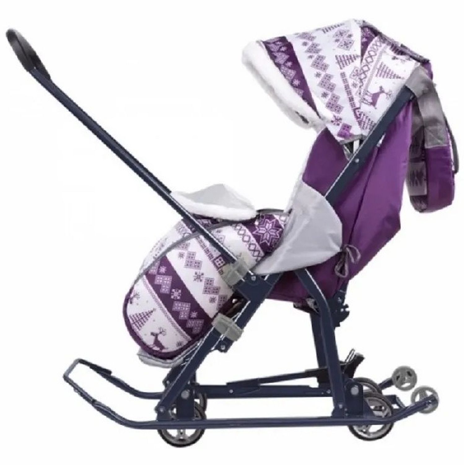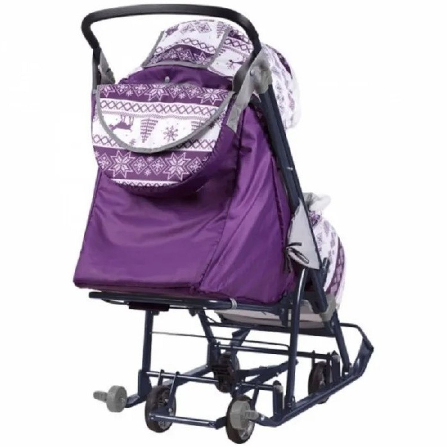 Коляска комбинированная с трансформируемым кузовом позволяет передвигаться по любой дороге. Нажатием ноги на педаль опускаются колеса, и вы можете везти коляску по асфальту или по гладкому полу. Еще одно нажатие — коляска трансформируется в санки и снова скользить по снегу!