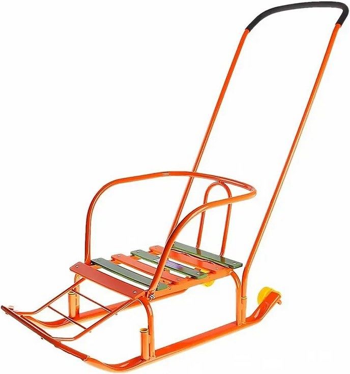 Материалы, используемые в санках: металлическая рама, деревянное сиденье, ремень безопасности из ременной ленты и морозостойкая пластмасса для колес.