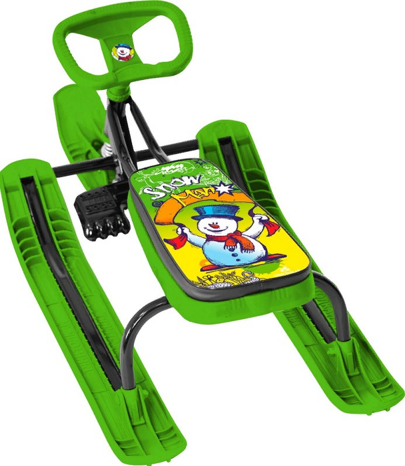 Снегокат - это и весёлое времяпрепровождение и средство передвижения на свежем воздухе в зимний период. Заряд энергии и массу удовольствия получат все члены семьи от прогулки и катания на снегокате со снежной горки. Стальная конструкция прочна и надежна, пластик из которого выполнены лыжи и руль — морозоустойчив ( до -25 0). Снегокат устойчив и легко управляем, для большей безопасности он имеет ограничитель угла наклона передней лыжи 180 0, а так же ножной тормоз. Модель снегоката яркого цвета с красочным принтом на сиденье понравится как детям, так и родителям.
