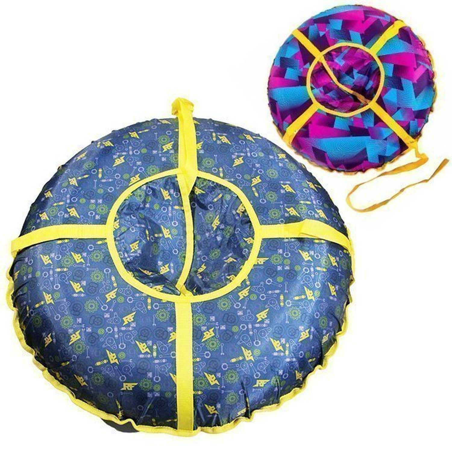 Верх и дно тюбинга выполнено из ПВХ материала высокого скольжения плотность материала 600-650 гркв.м. Все швы и посадочное место усилены капроновой лентой. Имеются буксировочный ремень и удобные ручки, а также замок от проникновения снега во внутрь чехла.