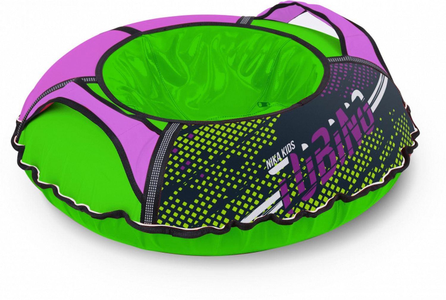 Тюбинг изготовлен из глянцевого тентового материала, ткани ПВХ, устойчивых к морозам до -25С. Усиленное дно, швы прошиты прочной капроновой нитью. Тюбинг оснащён транспортировочным ремнём и эргономичными ручками. Диаметр 90 см.
